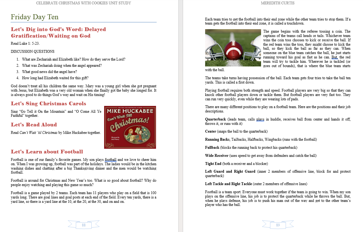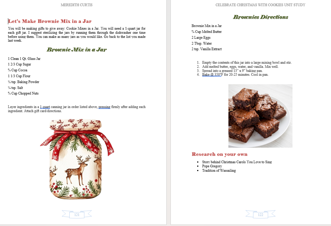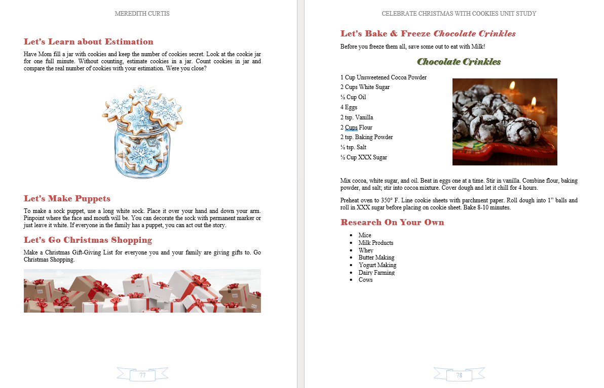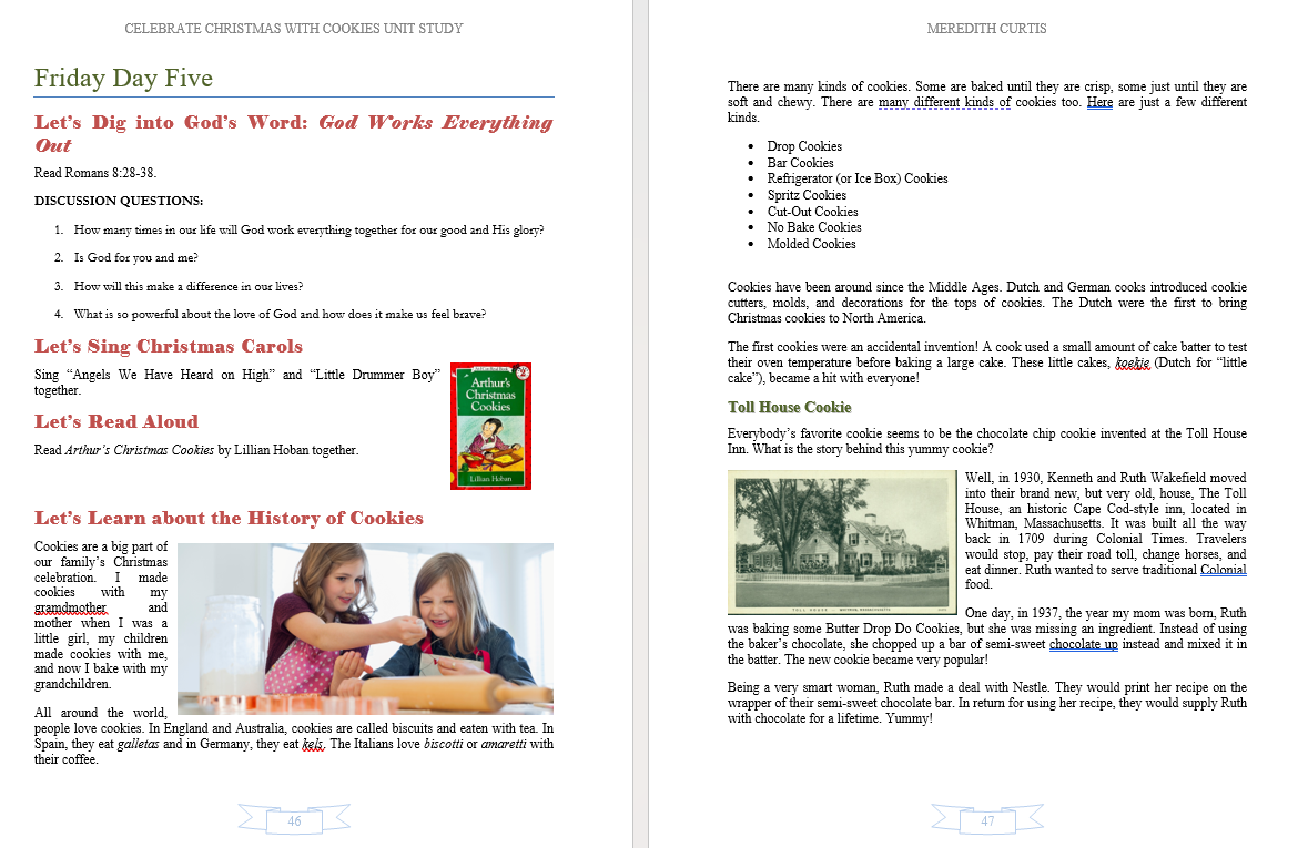 Everyone loves to snuggle up and read picture books together–what a perfect way to spend the morning each day of the unit study, along with devotions, lessons related to the picture books, and crafts. Made with love, Celebrate Christmas with Cookies Unit Study is jam-packed with mouth-watering recipes to make and bake for Christmas. You will bake and freeze cookies and make cookies mixes in a jar to give as gifts. Like all our unit studies, you will prepare for Christmas–it’s part of learning!